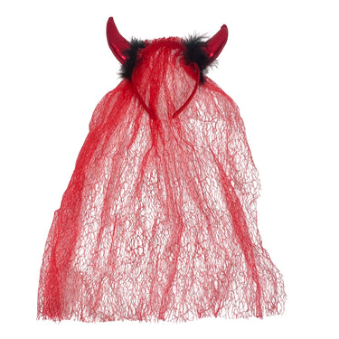 El cintillo combina detalles rojos intensos con un velo que cae delicadamente, logrando un look llamativo y característico de la diabla.