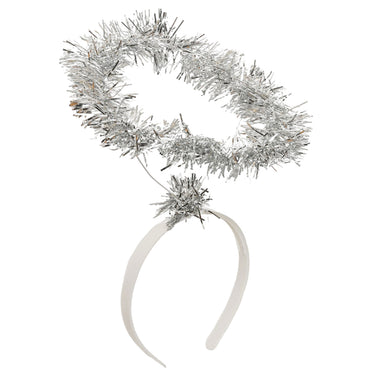 El aro metálico cubierto de escarcha plateada crea un efecto reluciente que destaca en cualquier ambiente, ideal para complementar atuendos angelicales y disfraces festivos.