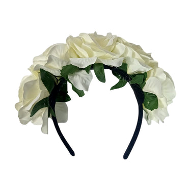 El cintillo incorpora flores blancas decorativas que aportan un look fresco, clásico y muy fotogénico, perfecto para destacar en cualquier ocasión especial.