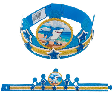 La corona viene en un vibrante color azul con glitter, decorada con estrellas blancas y doradas, y al centro trae al simpático tiburón Tralalero en la playa. Es llamativa, llena de brillo y se luce en todas las fotos del cumpleaños.