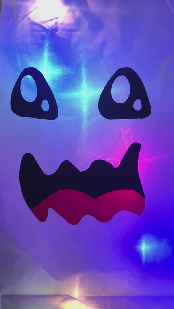 Decoración Halloween Fantasma con luces Led. Mide 47x36 cm aproximadamente.