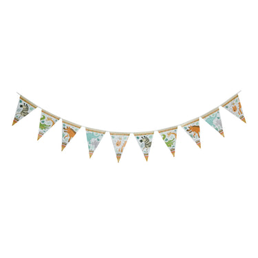 Decora tu fiesta con un espíritu salvaje y divertido con este banderín triangular repleto de tiernos animales de la selva, ideal para celebraciones llenas de color y alegría.