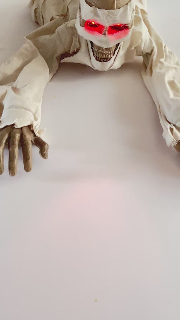 ¡Prepárate para el susto de la noche! Esta Momia animatronic que se arrastra por el suelo es el complemento perfecto para darle un toque espeluznante y realista a tu decoración de Halloween.