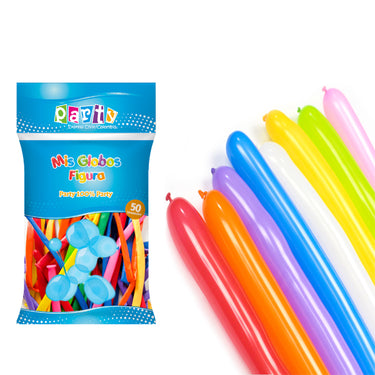 Globos largos tipo figura, ideales para hacer animales, flores, espadas o decoraciones creativas. Incluyen colores surtidos para un toque alegre y festivo.