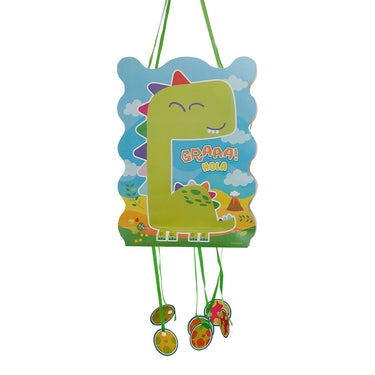 Con un tierno dinosaurio verde en un paisaje jurásico, esta piñata es ideal para decorar y entretener al mismo tiempo.