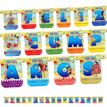 Decora tu fiesta con espíritu pirata y mucha energía con esta guirnalda feliz cumpleaños temático de One Piece, perfecto para ambientar cualquier cumpleaños celebración con el estilo inconfundible de Luffy y su tripulación.