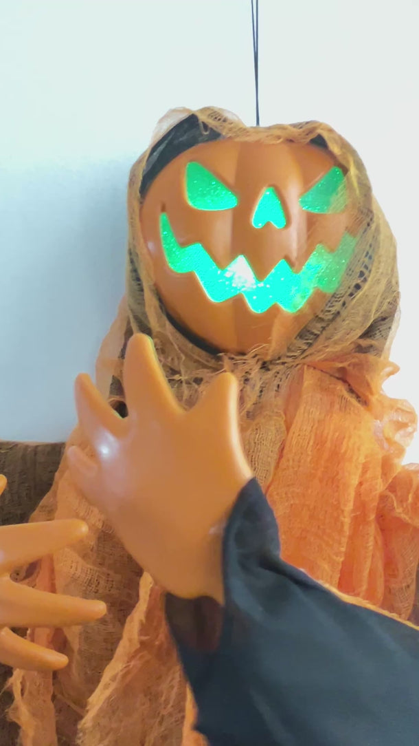 ¡Haz que tu decoración de Halloween cobre vida con este espanto colgante de calabaza! Con su rostro iluminado, sonidos aterradores y movimiento inquietante, será el centro de todas las miradas y el susto perfecto para tus invitados.