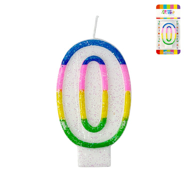 Celebra con brillo y color tus momentos más especiales con esta vela numeral #0. Su diseño multicolor con detalles en glitter aporta un toque festivo y llamativo a cualquier torta de cumpleaños o celebración.