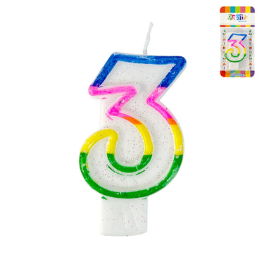 Celebra con brillo y color tus momentos más especiales con esta vela numeral #3. Su diseño multicolor con detalles en glitter aporta un toque festivo y llamativo a cualquier torta de cumpleaños o celebración.