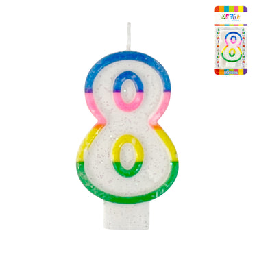 Celebra con brillo y color tus momentos más especiales con esta vela numeral #8. Su diseño multicolor con detalles en glitter aporta un toque festivo y llamativo a cualquier torta de cumpleaños o celebración.