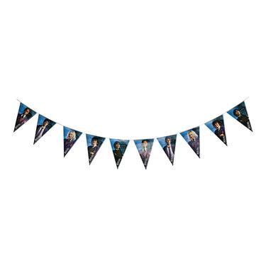 Crea una atmósfera enigmática y mágica en tu fiesta con este banderín triangular inspirado en los personajes de Merlina, la serie más oscura y fascinante del momento.
