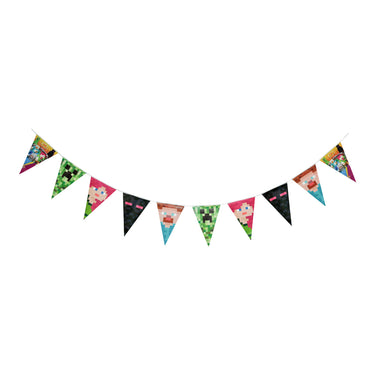 ¡Decora tu celebración con todo el estilo del universo Minecraft! Este banderín triangular es ideal para ambientar fiestas temáticas con los personajes pixelados más reconocidos del videojuego.