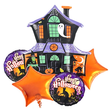 Incluye un globo con forma de casa embrujada, 2 globos con forma de estrella y 2 globos redondos impresos con motivos de Halloween.