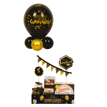 Ideal para despertar al cumpleañero con un desayuno especial, celebrar en la oficina o armar un detalle para entregar a domicilio. El diseño en negro con detalles dorados se ve sofisticado y sirve tanto para adultos como para adolescentes.